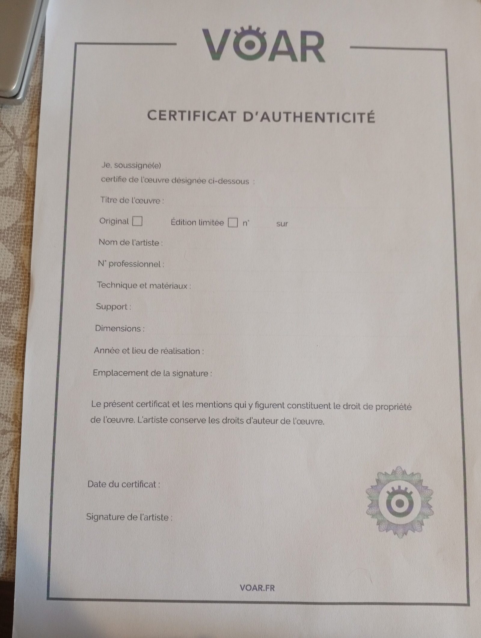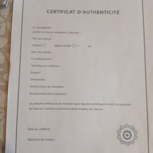 Aucun remboursement ne sera effectué après l’envoi de l’œuvre. Les variations de couleurs entre les photos et l’œuvre réelle peuvent exister, selon les réglages d’écran : cela ne constitue pas un motif de remboursement. Si vous souhaitez annuler votre commande, merci de le signaler dans un délai de 24h maximum après la confirmation d’achat. Passé ce délai, l’œuvre sera considérée comme vendue définitivement.