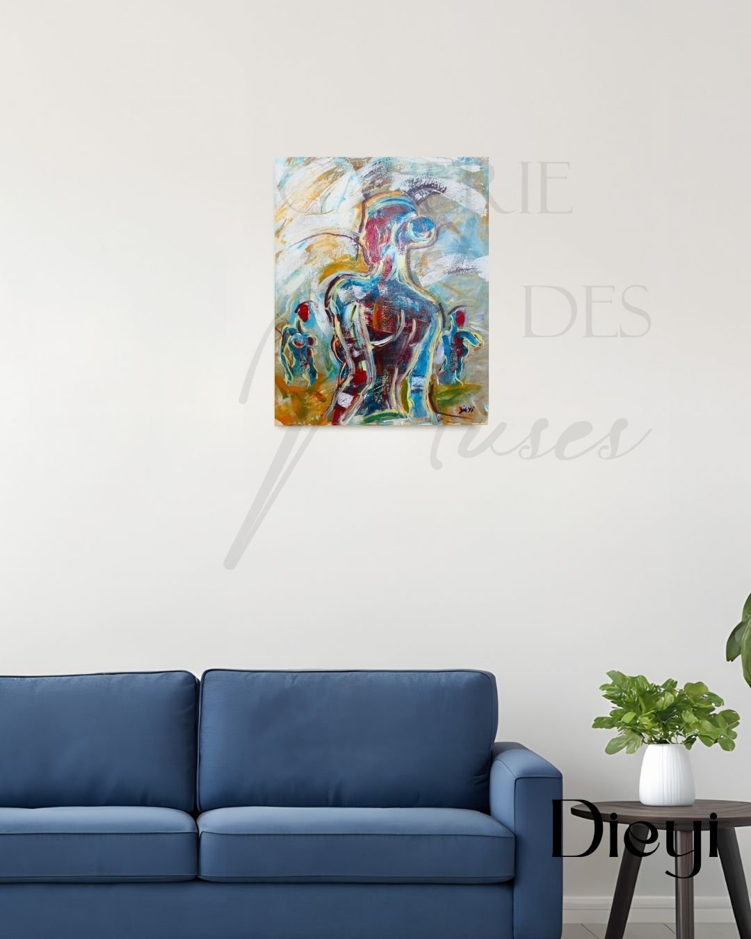 Cette toile s’impose naturellement dans un intérieur contemporain, un espace de travail créatif ou une collection privée. Elle trouve également toute sa place dans une galerie ou un showroom, où son énergie visuelle attire immédiatement le regard et invite à une lecture sensible et personnelle.