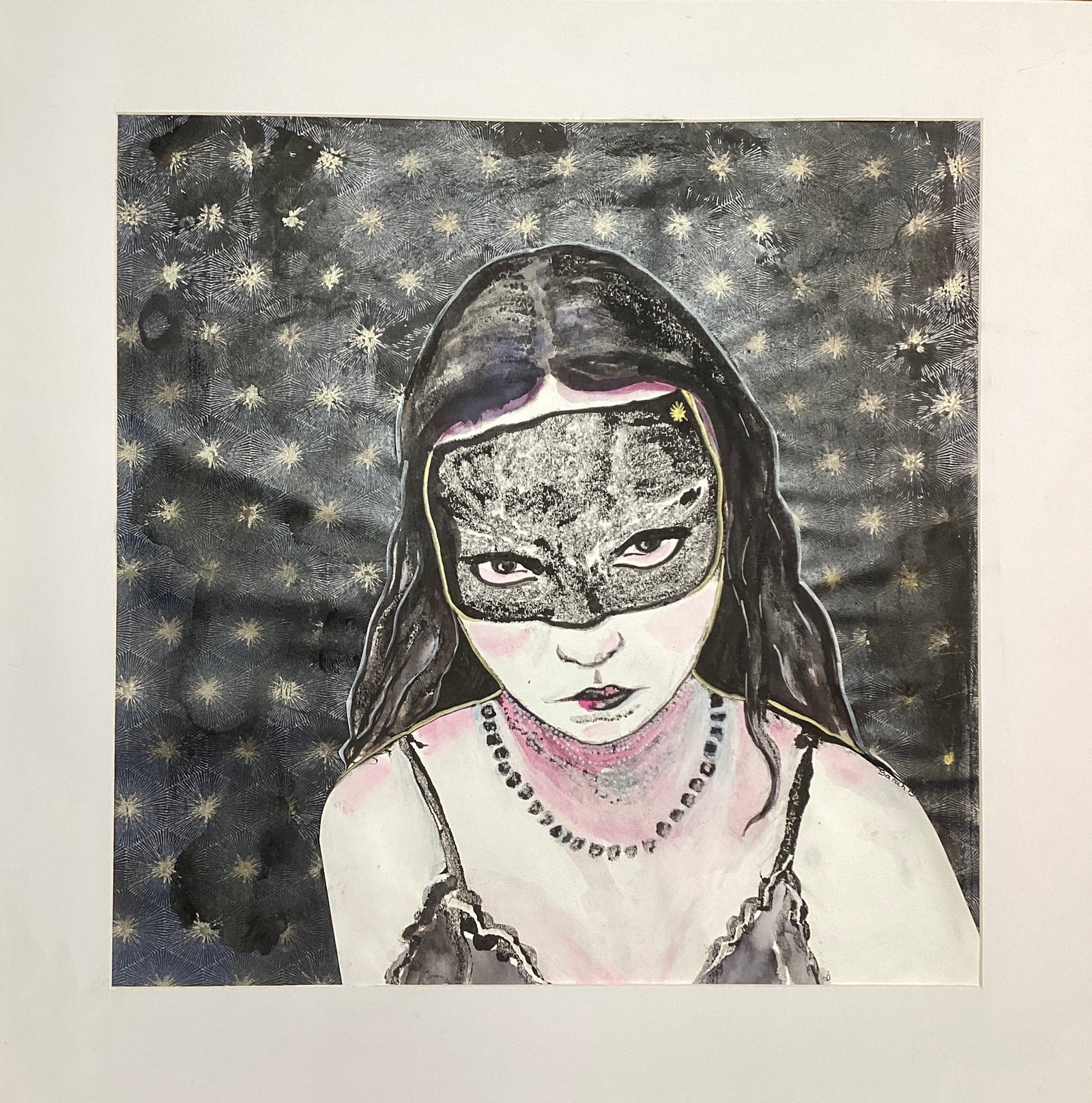 Monotype sur papier retravailler au feutre, découper et coller sur papier peint, le tout présenter avec un passe-partout (50×50 hors tout).