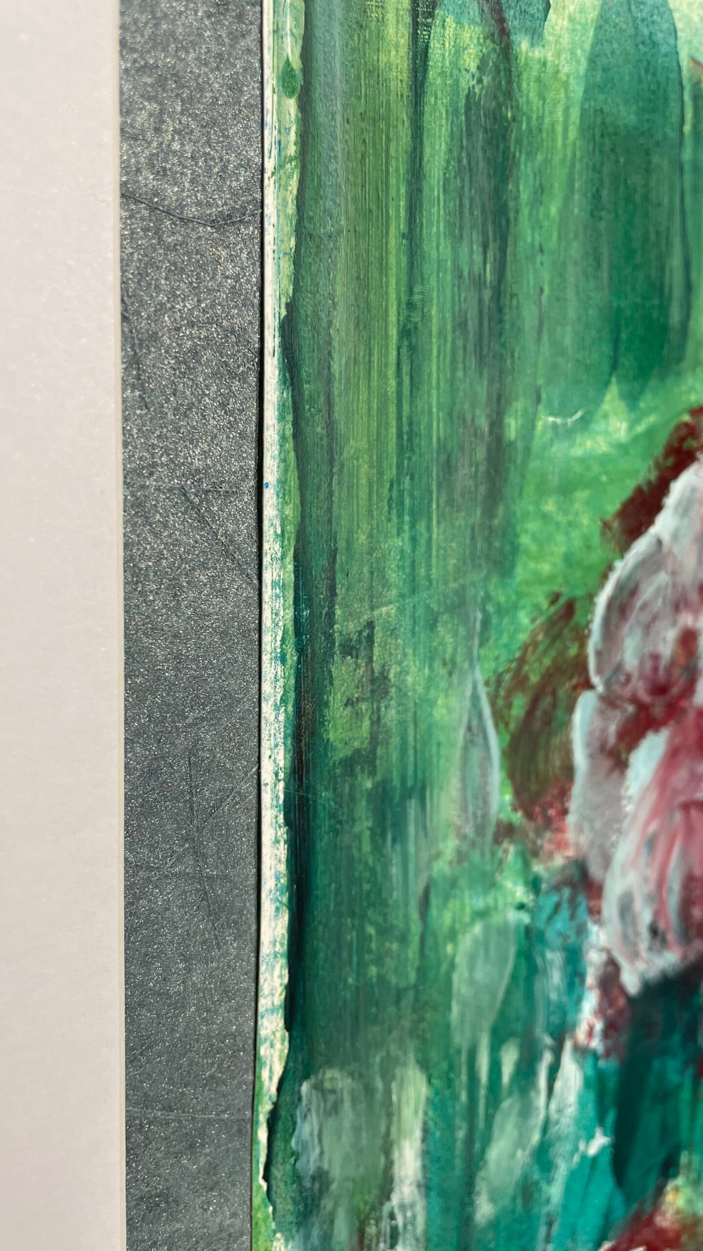 Collé sur un papier peint texturé gris argenté.