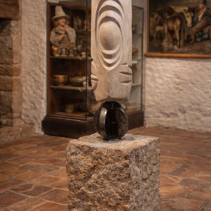Avec PEU, Jean-Jacques Bader propose une œuvre sobre et puissante, où la matière semble volontairement réduite à l’essentiel. La sculpture joue sur l’équilibre entre masse et ouverture, mettant en valeur le vide comme un élément à part entière de la composition. L’ouverture centrale devient un point de respiration, un passage symbolique qui capte la lumière et transforme la perception de l’ensemble.
