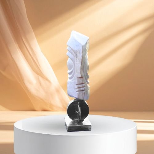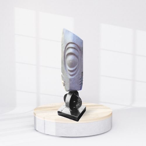 Les lignes sont franches, maîtrisées, presque architecturales, tandis que la surface conserve une texture minérale qui rappelle l’origine brute du matériau. Cette dualité entre rigueur formelle et présence organique confère à l’œuvre une grande profondeur visuelle.