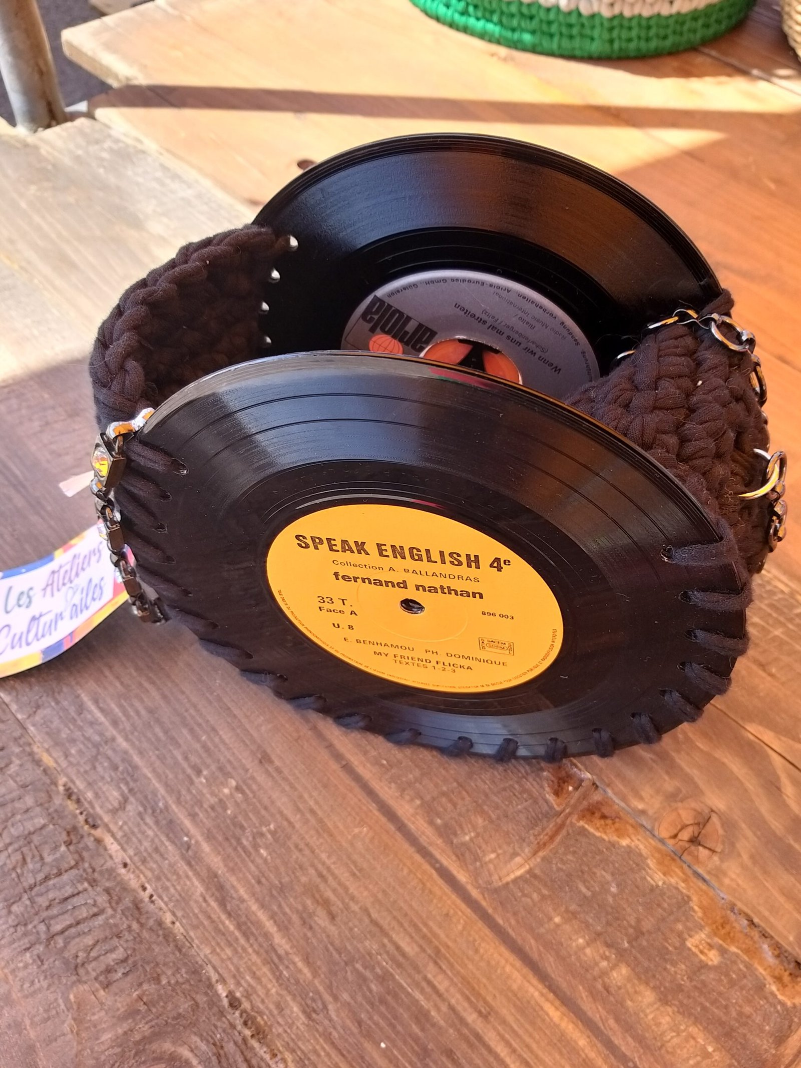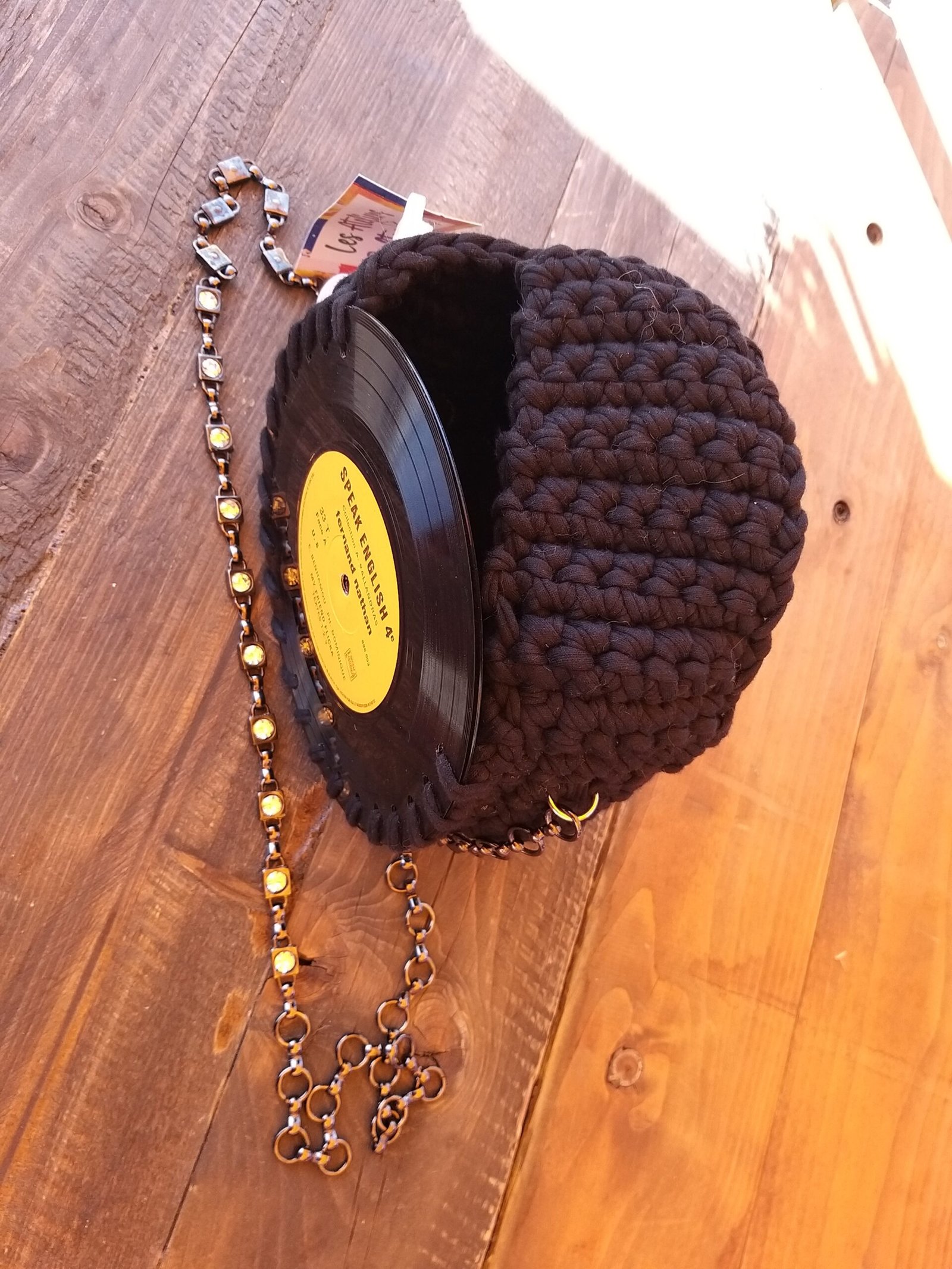 Faite sensation avec cet original sac fait à partir de vieux vinyles 45 tours recyclés, assemblés avec du trapilho crocheté noir, une bandoulière en chaine métal avec diamants, un rabat pour fermer le sac.