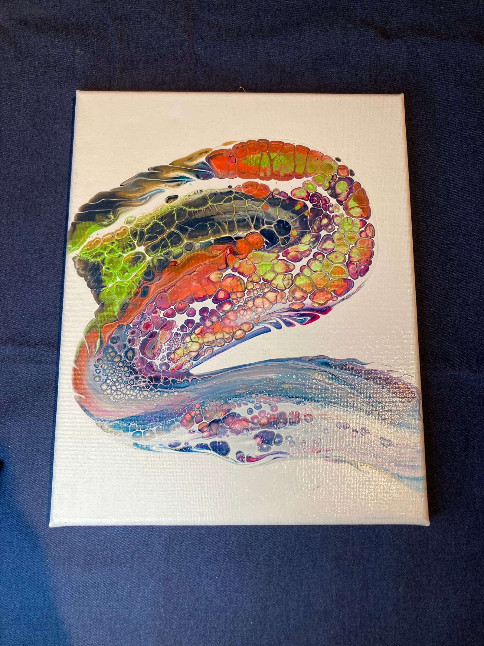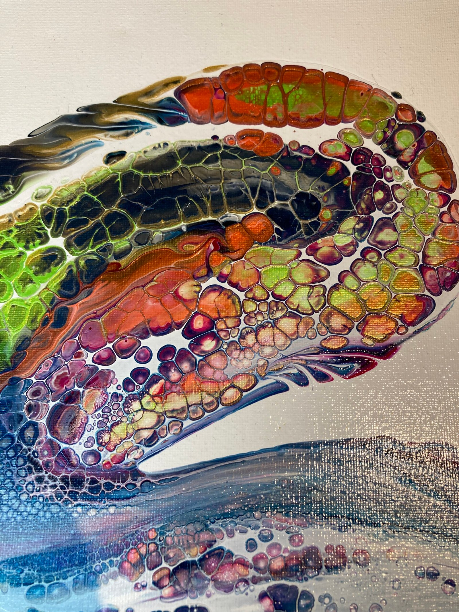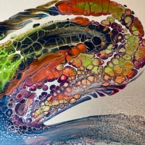 Sur un fond blanc immaculé, des volutes de vert et d’orange s’étirent en un mouvement sinueux. La technique du swipe révèle une profusion de cellules organiques, comme des écailles vivantes qui ondulent le long de cette trajectoire fluide.
